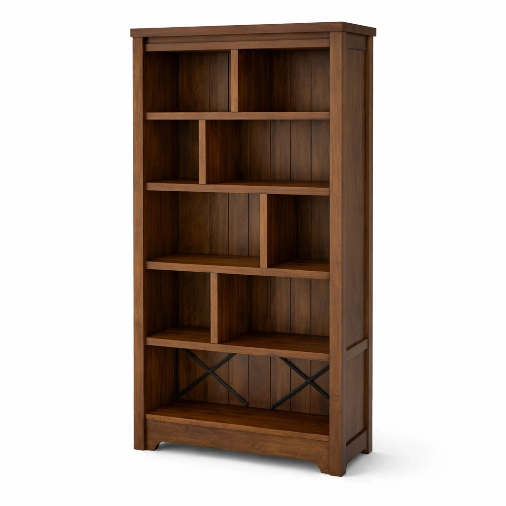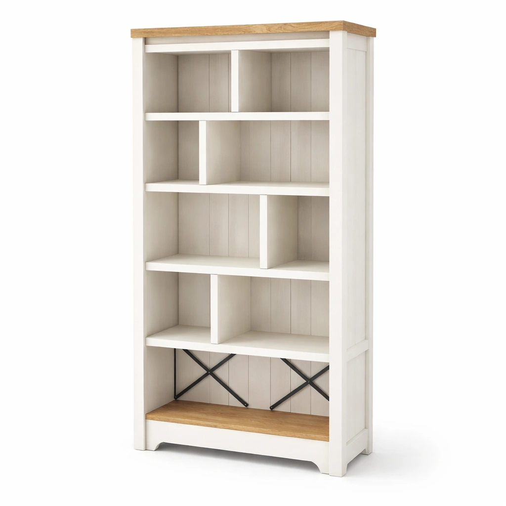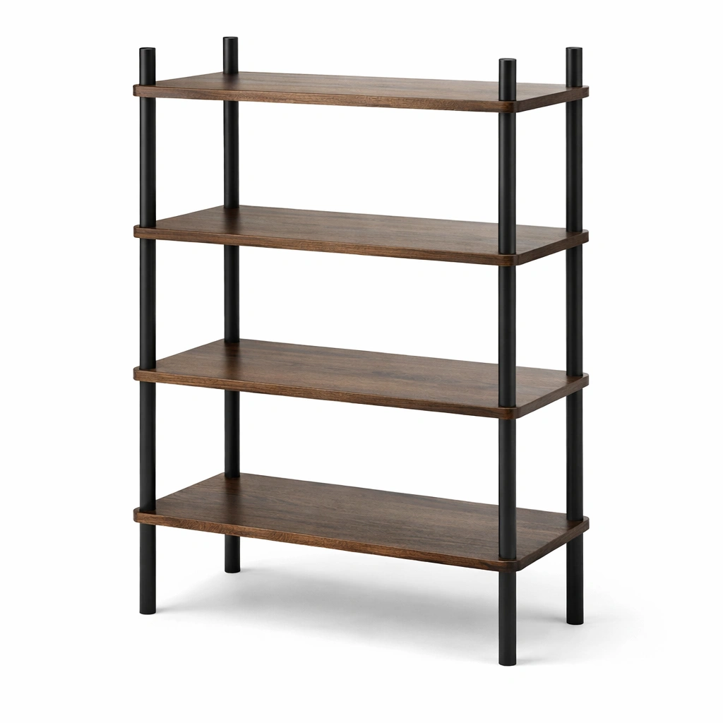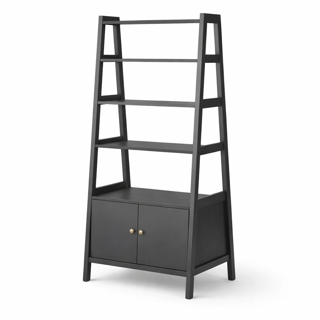 Estanteria de diseno moderno con varios niveles abiertos y armario cerrado, ideal para organizar y decorar espacios interiores.